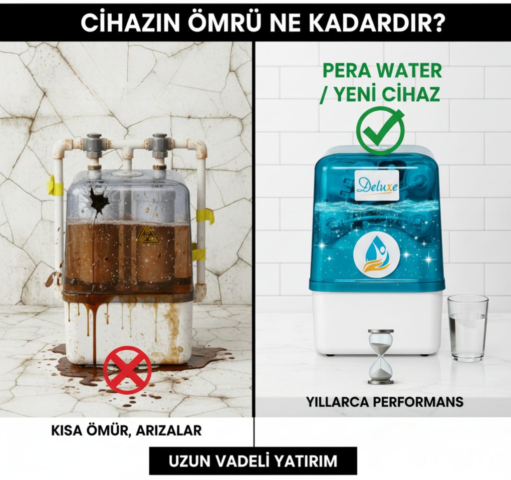 Su arıtma cihazının ömrü, kullanım yoğunluğu, su kalitesi ve düzenli bakımına bağlı olarak 5–10 yıl arasında değişir.