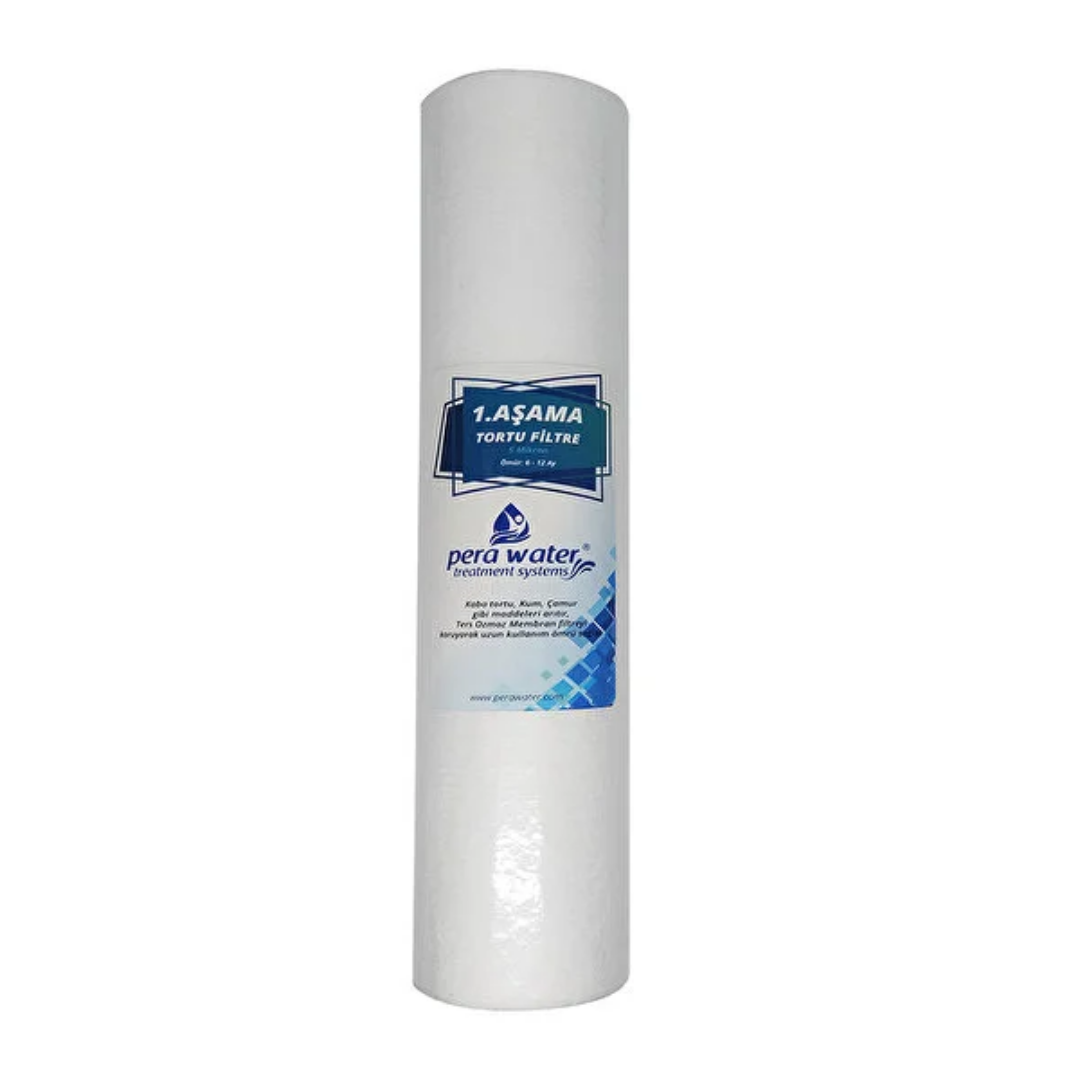 1.Aşama 5 Micron sediment filtre su da bulunan tortunun arıtılarak mebran filtrenn korunmasını sağlar.
