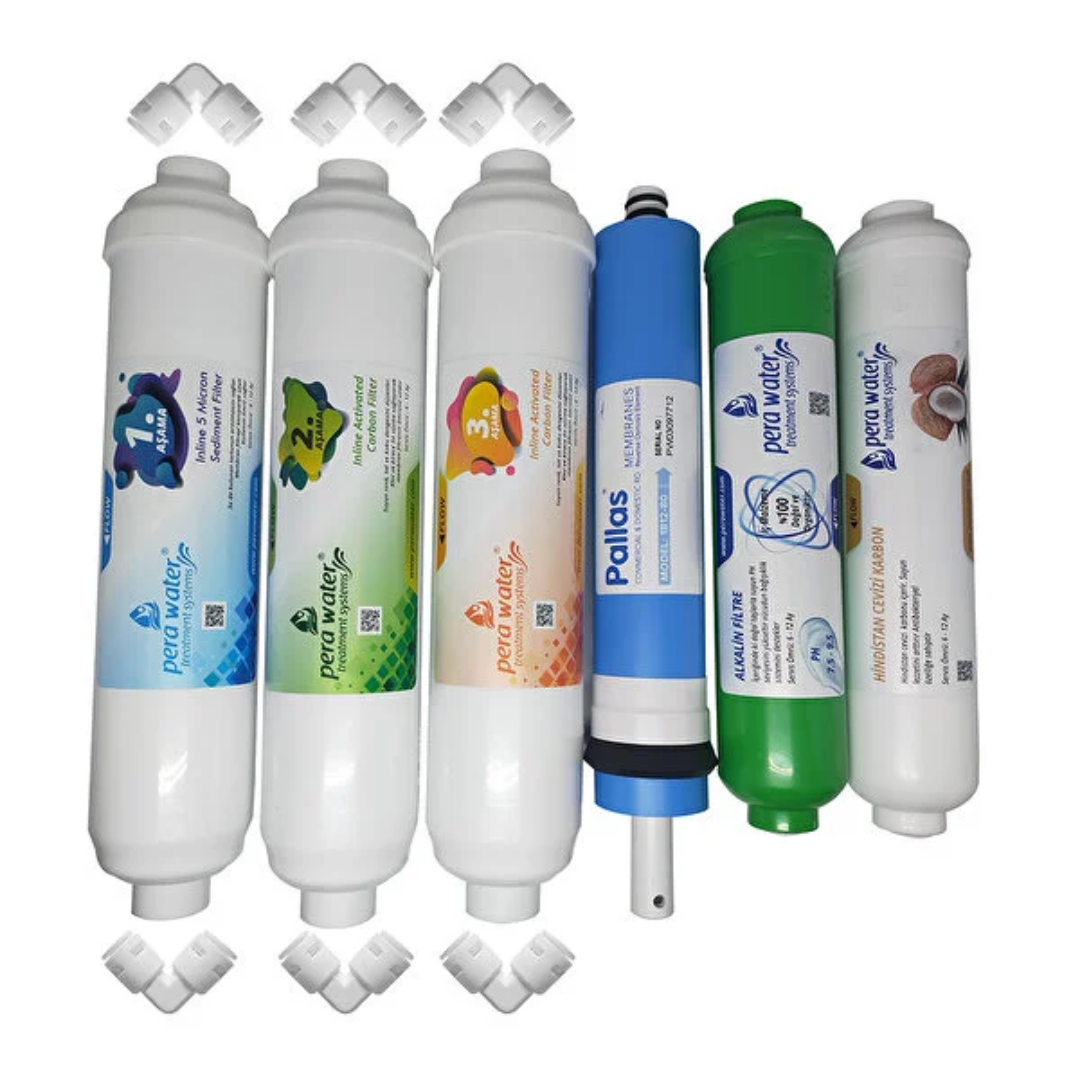 Pera Water Kapalı Kasa Su Arıtma Cihazlarına Uygun Pallas 80 Gpd İnline 6’li Alkali Filtre Seti Bağlantı Dirseği Hediyeli Alkali Filtre
