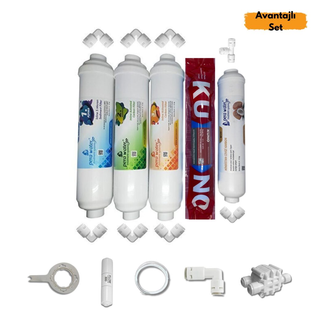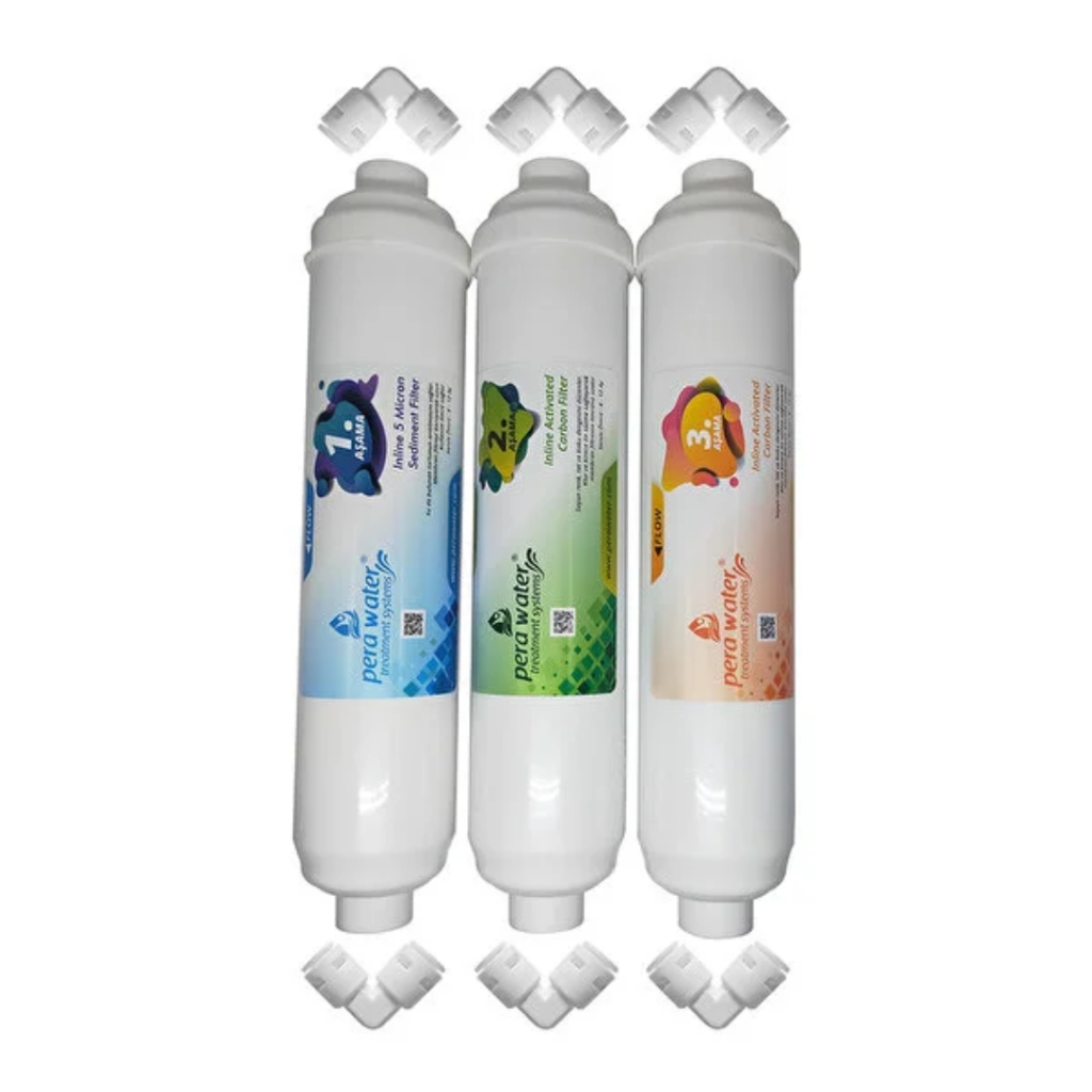 Pera Water Kapalı Kasa Su Arıtma Cihazlarına Uygun Mebransız İnline 5’li Alkali Filtre Seti Bağlantı Dirseği Hediyeli Alkali Filtre